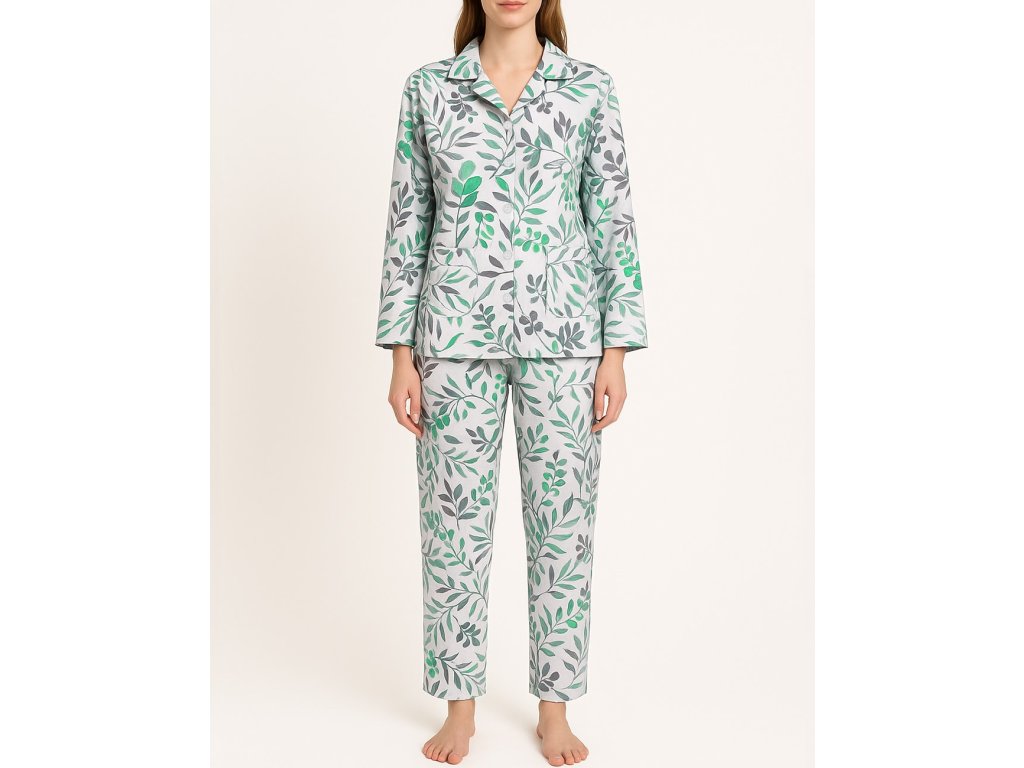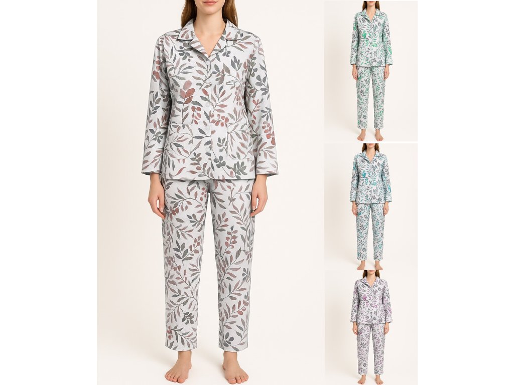 Teploučké pyžamo s propínáním na knoflíky. Kalhoty mají gumu v pase a rovné nohavice. Materiál pruží jen mírně a na rubu je nepatrně počesaný. Horní díl je zdobený límcem a dvěma předními kapsičkami na drobnosti. Tento model je celoplošně potištěn rostlinným vzorem - listy a květy.