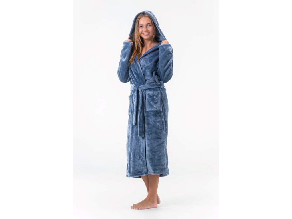 Tento model má v předu na každé straně kapsu. Župan má na vnitřní straně stužku na uvázání spodního dílu, přes který následně přeložíte díl svrchní a utáhnete páskem. Oceníte i praktickou kapuci obzvlášť, když vyběhnete z koupelny s mokrými vlasy.