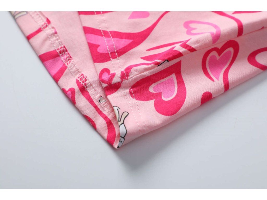 Krásné šatičky s potiskem rozvlněných srdíček a lištiček. Šaty mají v pase pružnou gumičku dozdobenou našitou šňůrkou zavázanou do mašle. Kulatý výstřih a krátký rukáv. Vhodné pro každodenní nošení i pro zvláštní příležitosti.