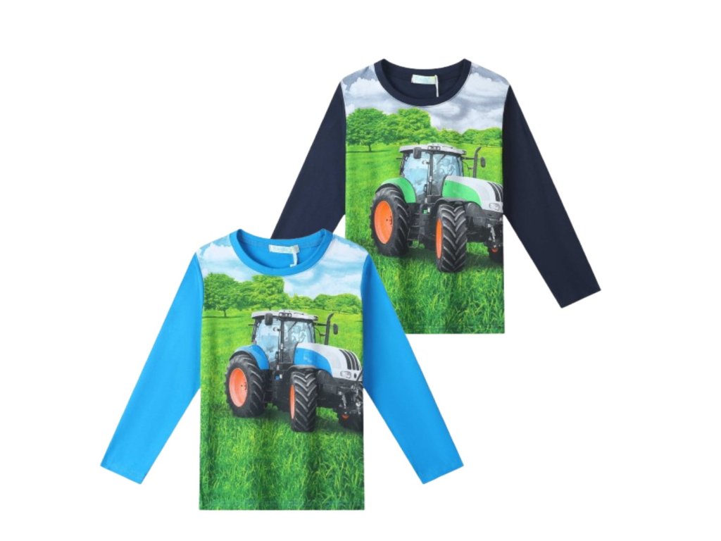 Pro malé milovníky traktorů! Toto stylové chlapecké tričko s dlouhým rukávem zaujme každého fanouška zemědělských strojů. Přední díl je kompletně potištěn realistickým obrázkem traktoru na zelené louce, což dodává tričku jedinečný vzhled.