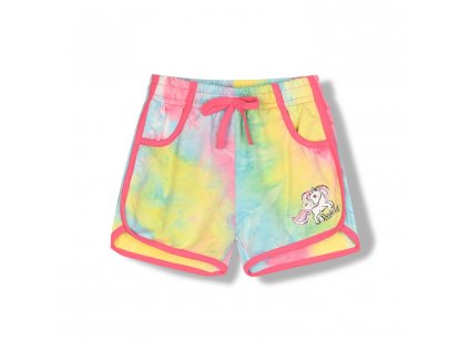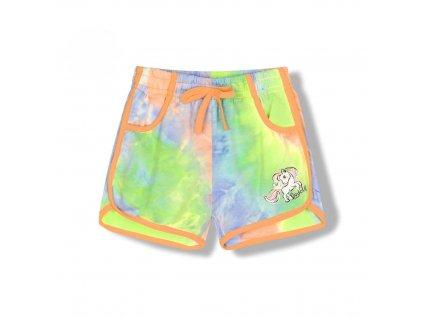 Vzdušné kraťasy vhodné pro sport i pro každodenní nošení. Pas a lemy jsou obšité duhovou batikou. Na levé nohavici je natištěný nápis DANCE. V pase je široká guma a šňůrka na stažení.