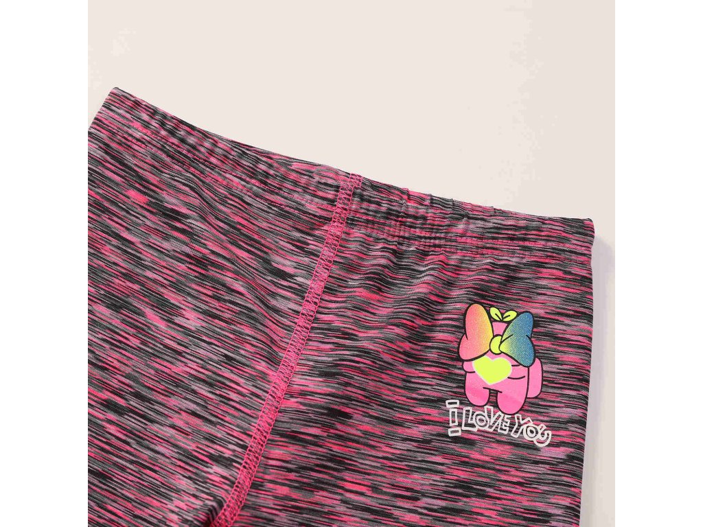 V teplých letních dnech se hodí stylové tříčtvrteční legíny. Jsou krásně pružné, dá se v nich i cvičit, běhat a zažívat spoustu dalších zábaviček. na levém boku je potisk postavičky ze hry Among us a nápis I love You.