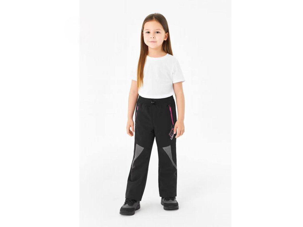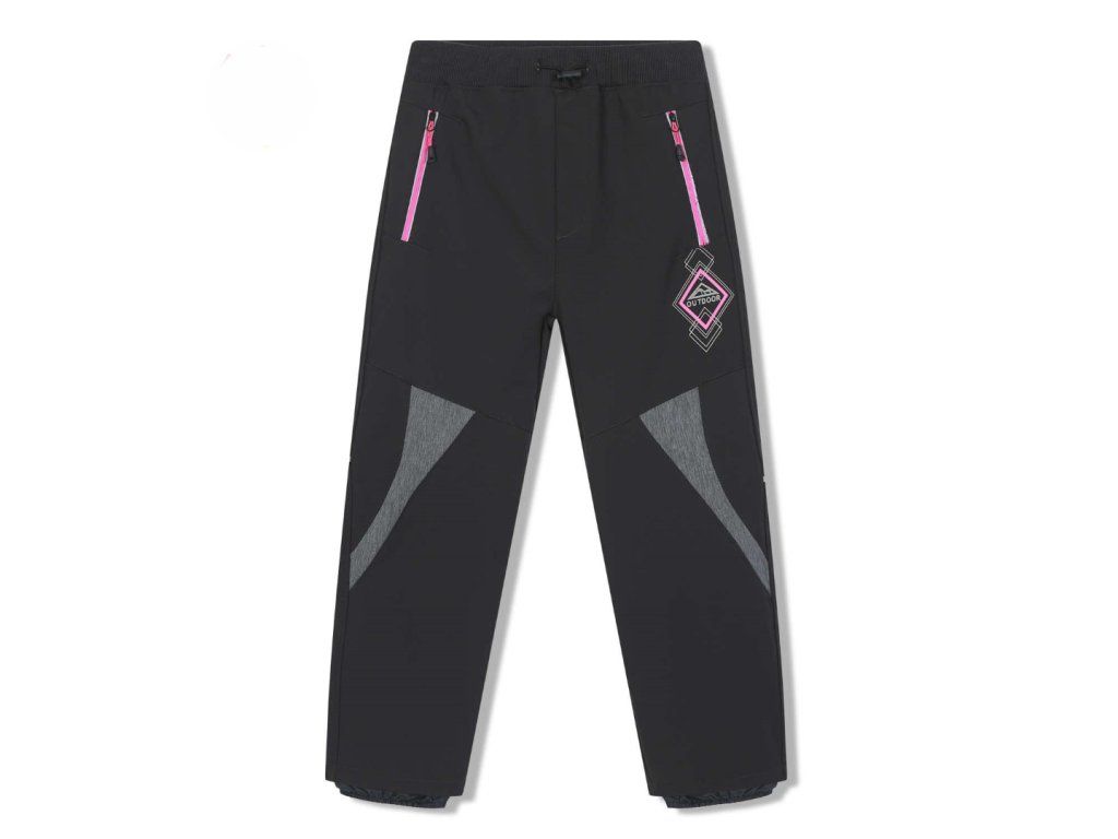 Teplé kalhoty s fleecovou podšívkou na rubu a měkkou softshell vrstvou na povrchu. Kalhoty mají reflexní prvky na růžových zipech u kapes. Široká guma v pase s olivkou a kulatou gumičkou k utažení na lícové straně. Nohavice mají všitou šusťákovou vsadku s gumou, která brání profouknutí a vniknutí sněhu pod kalhoty. Od kolen šikmo dolů je tento model dozdoben šedými ozdobnými vsadkami. Zezadu jsou na nohavicích našité reflexní pruhy v oblasti kolen pro větší bezpečnost.