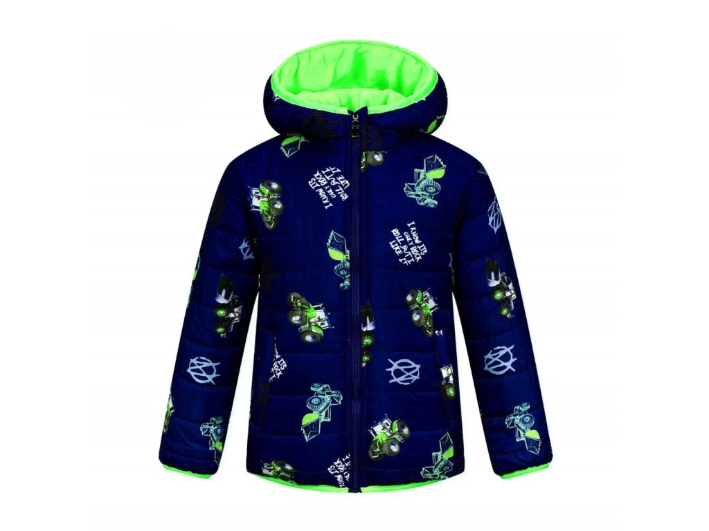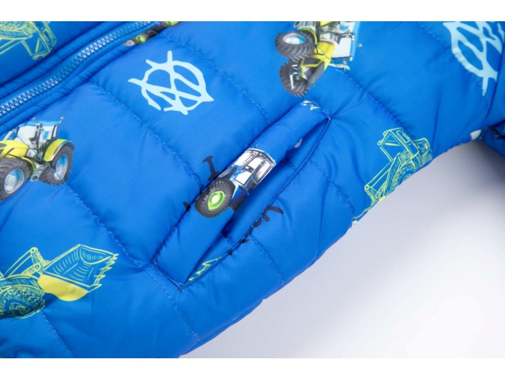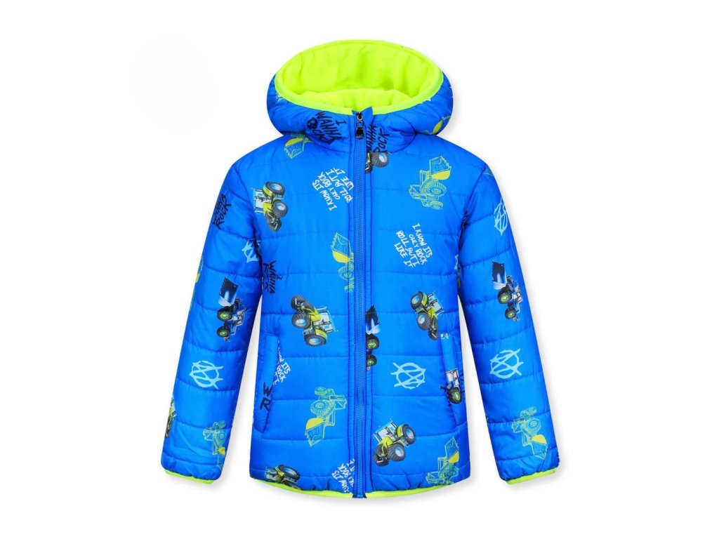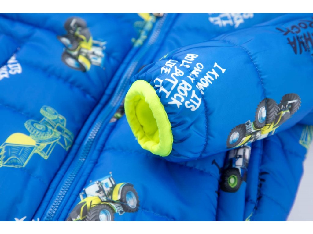Parádní zateplená bunda pro malé milovníky zemědělských strojů. Kapuce, rukávy i pas jsou lemované pružnou lemovkou, která účinně chrání tělo před profouknutím větrem a před únikem tepla z pod bundy. Bunda je prošívaná a má dvě kapsy. Propínaní je na zip. Uvnitř je bunda podšitá flísem. Kluky potěší zejména celoplošný potisk obrázků kolových nakladačů a traktorů. Ideální bunda pro chladné počasí a nové zážitky.