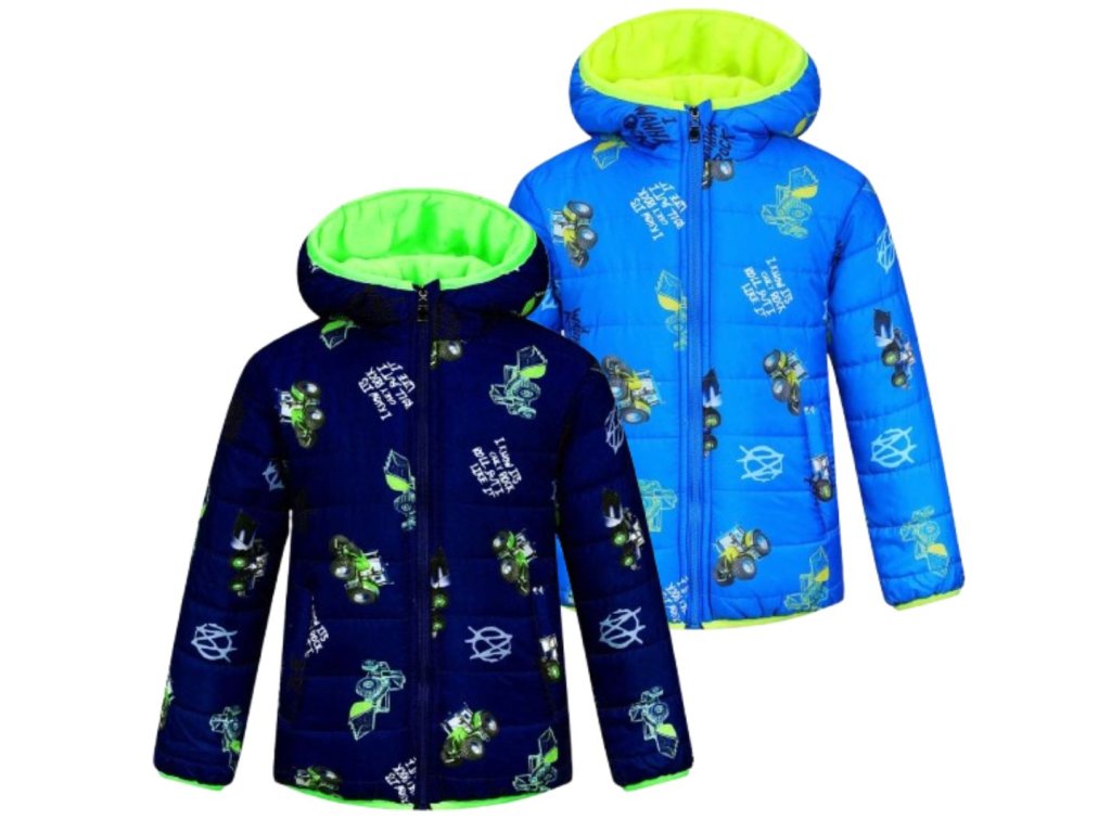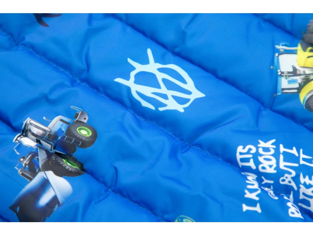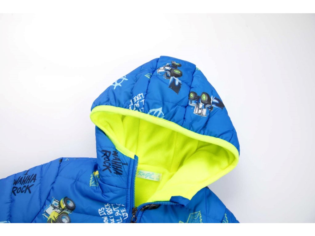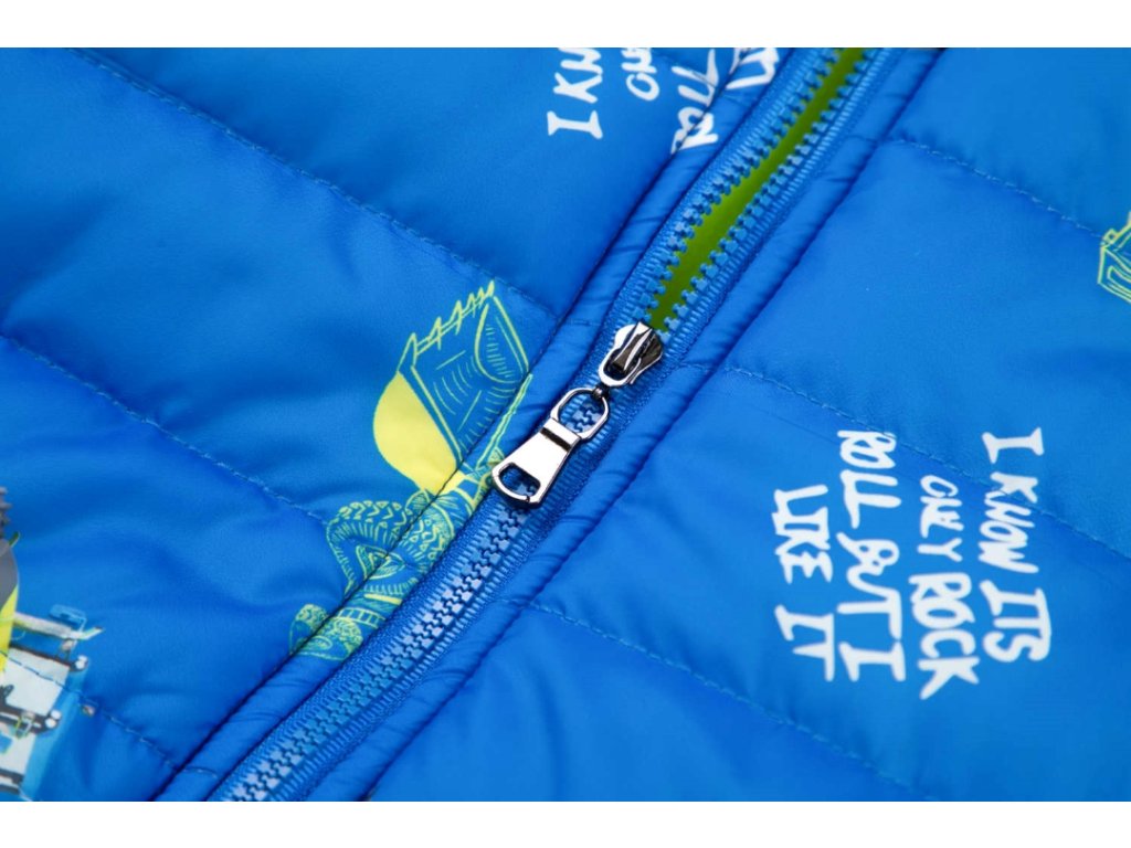Parádní zateplená bunda pro malé milovníky zemědělských strojů. Kapuce, rukávy i pas jsou lemované pružnou lemovkou, která účinně chrání tělo před profouknutím větrem a před únikem tepla z pod bundy. Bunda je prošívaná a má dvě kapsy. Propínaní je na zip. Uvnitř je bunda podšitá flísem. Kluky potěší zejména celoplošný potisk obrázků kolových nakladačů a traktorů. Ideální bunda pro chladné počasí a nové zážitky.