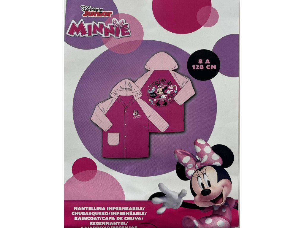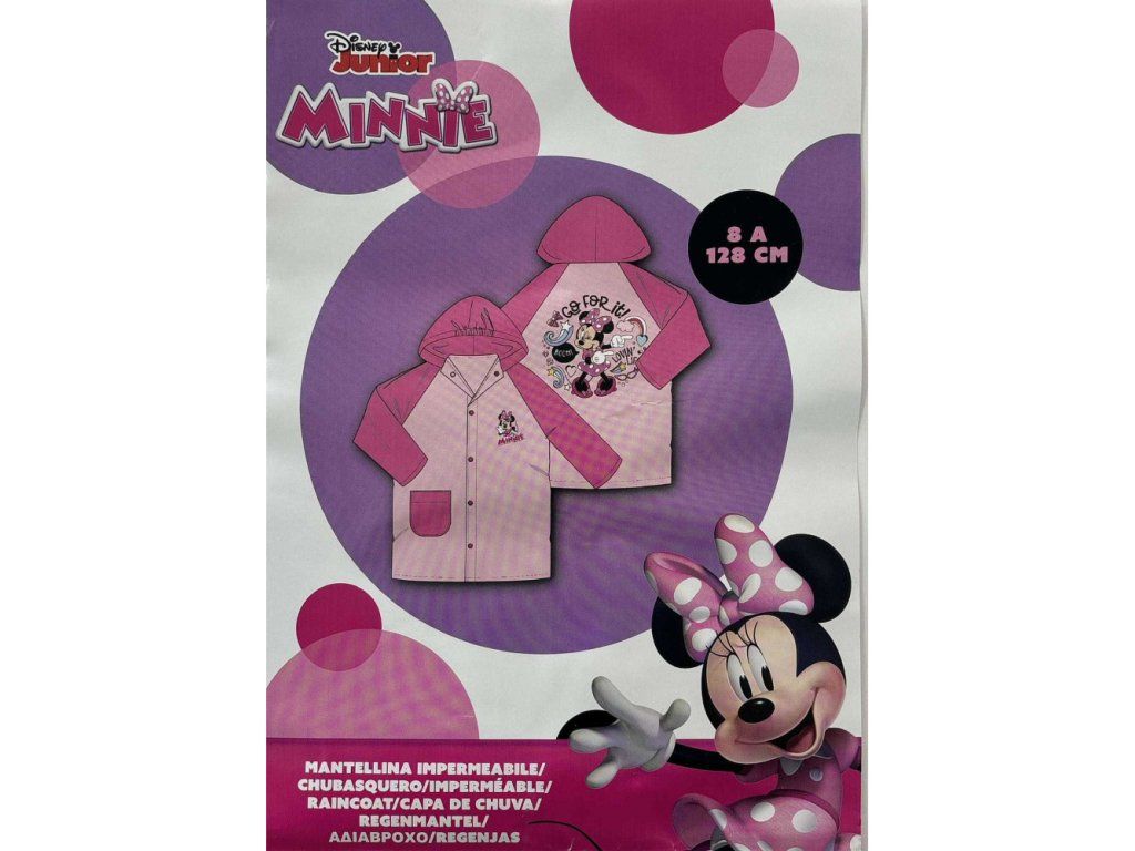 Veselá pláštěnka s obrázky roztančené myšky Minnie z Disneyho klubíku. Jednoduché zapínání na druky malá kapsička a kapuce, vybavená gumičkou v oblasti čela, díky které kapuce drží i ve větru.