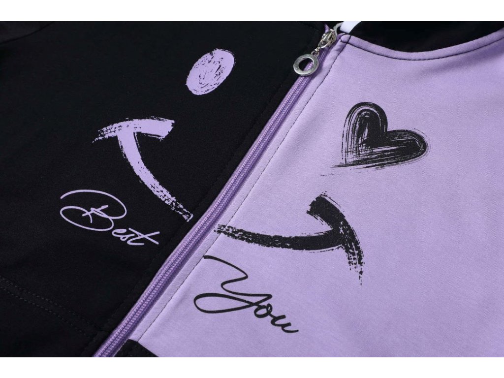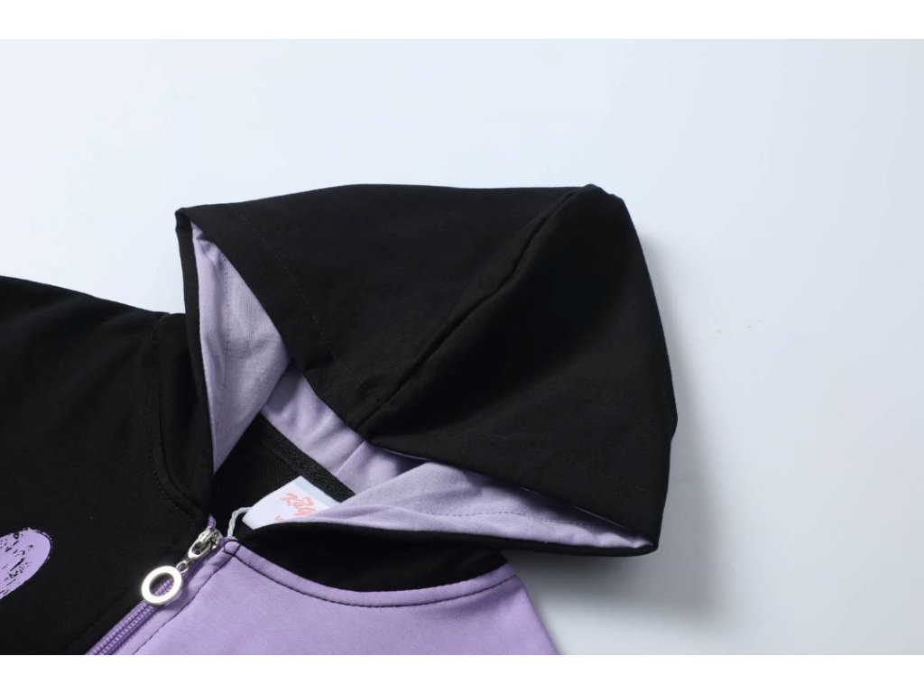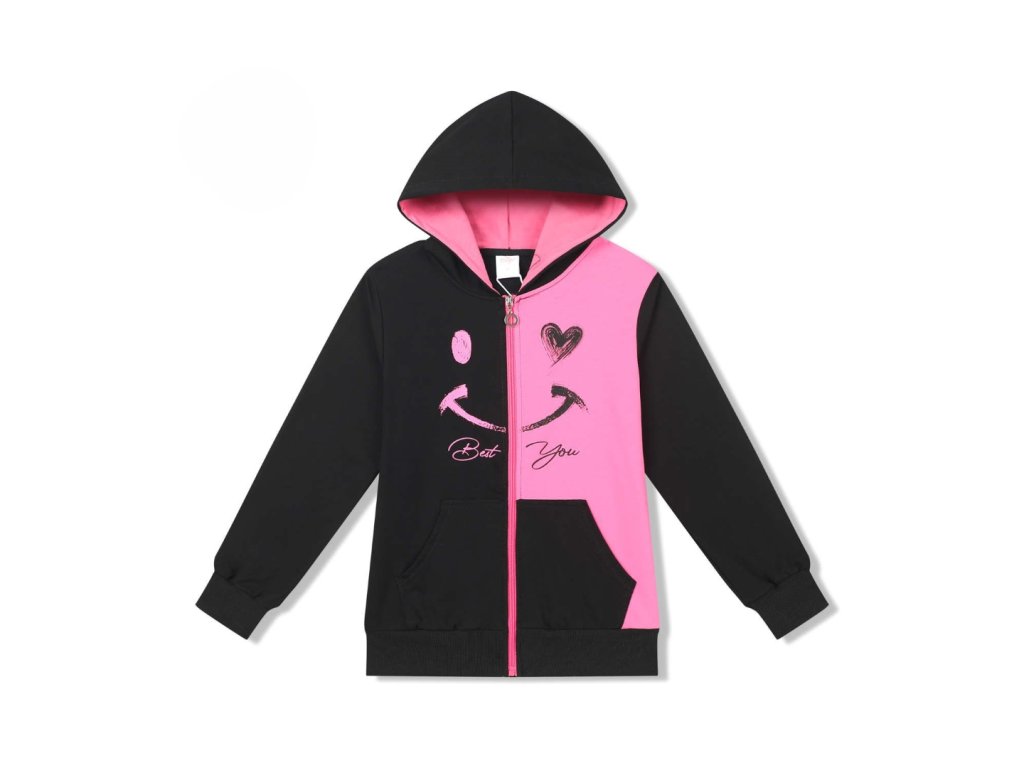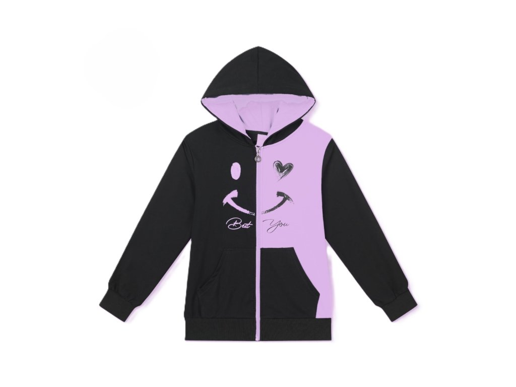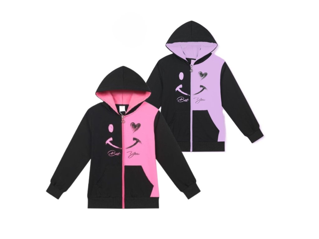Moderní design dvoubarevného provedení této slabé mikiny s kapucí upoutá hned na první pohled. Rukávy i pas je zakončený pružnými náplety, kapsy jsou umístěné u propínání. Působí při zapnutém zipu jako ,,klokanka". Mladým děvčatům dodá tato mikina osobitý výraz a styl.