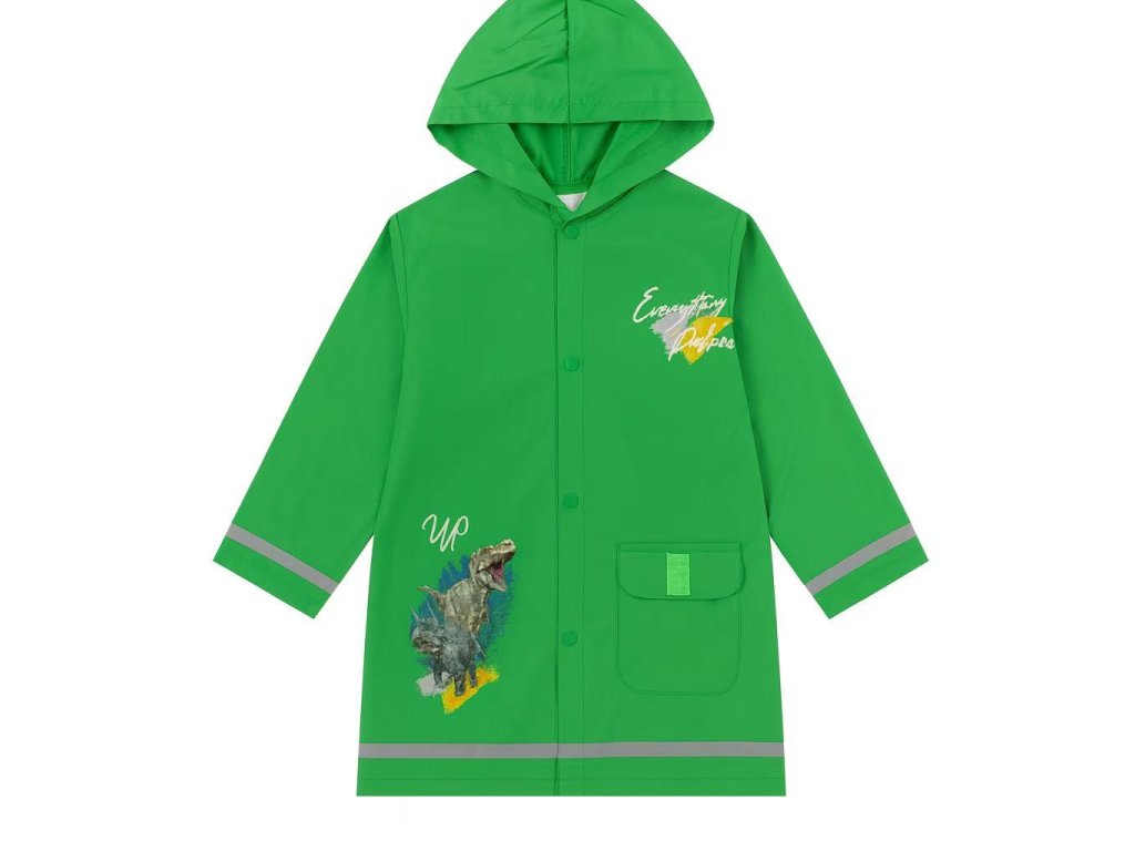 Chlapecká pláštěnka na patenty s kapucí, která má v oblasti čela gumičku, aby lépe držela na hlavě. Pláštěnka je jednobarevná (zelená) s obrázkem dinosaurů (t-rex a triceratops). Menší dino obrázek je na prsou na pravé straně a velký na zádech. Na levé straně má kapsičku na drobné předměty. Je opatřena reflexními páskem na spodním okraji. Balená je v praktické kapsičce.