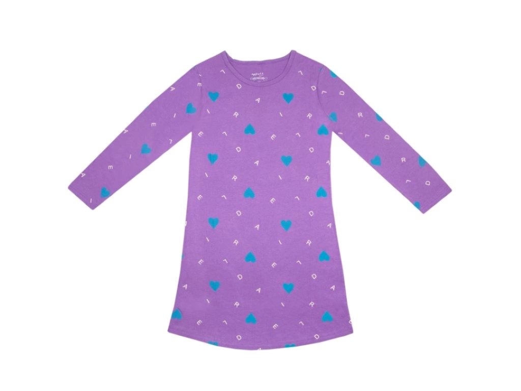 Pohodlná noční košilka z příjemné 100% bavlny. Má dlouhý rukáv, mírně projmutý střih a kulatý výstřih. Pro zpestření fialového podkladu jsou na košilce celoplošně natištěna srdíčka a písmenka. Materiál je prodyšný a krásně savý. Spaní v této noční košili bude klidné a pohodlné.