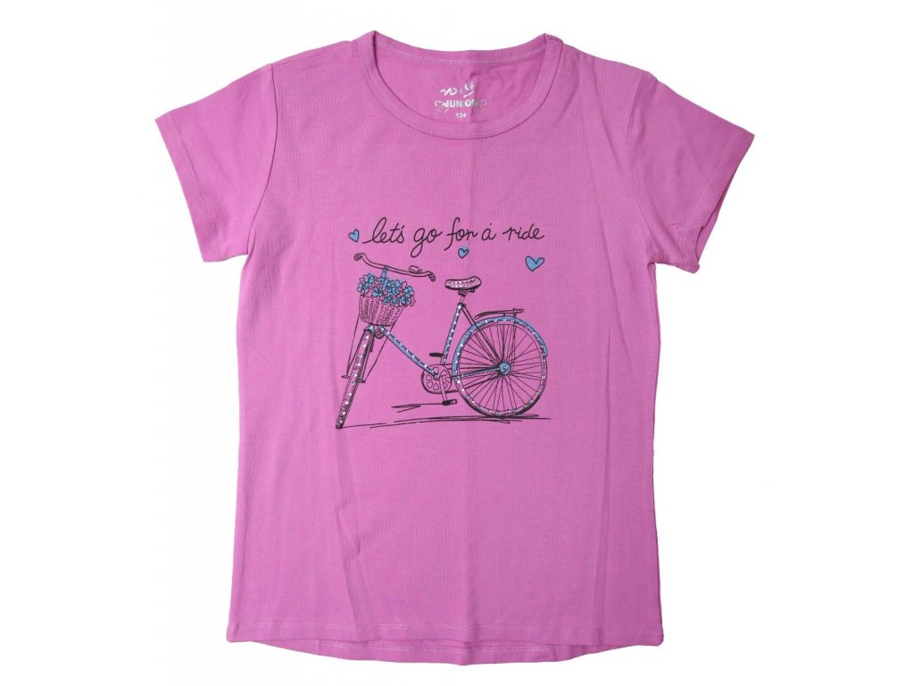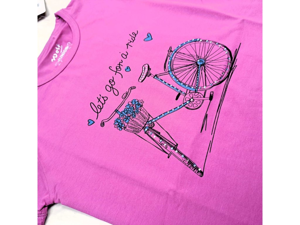 Elegantní tričko s obrázkem jízdního kola, které je efektně ozdobené drobnými kamínky. Nad kolem je malý nápis ,,let´s go for a ride". Tričko má krátký rukáv a kulatý výstřih. Jeho zadní díl je o 2 cm delší než přední. Mírně projmutý střih.