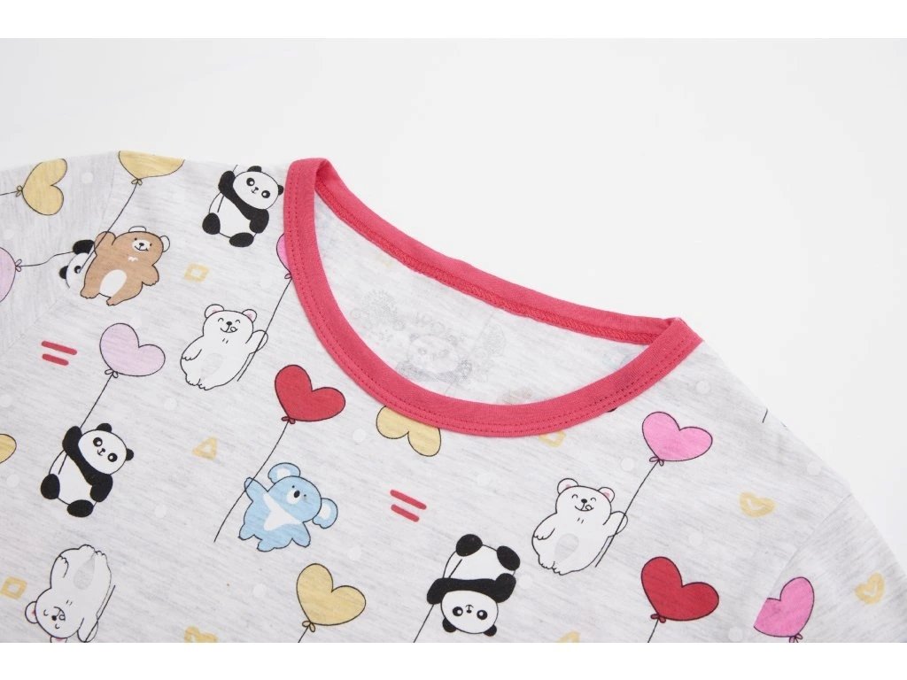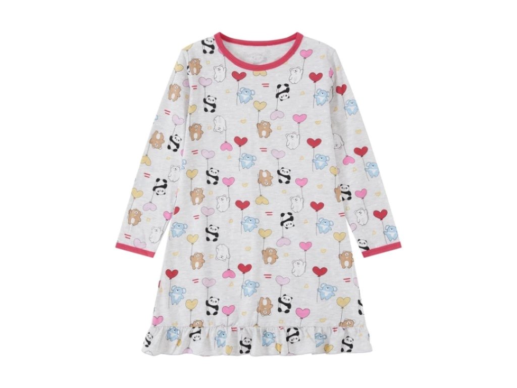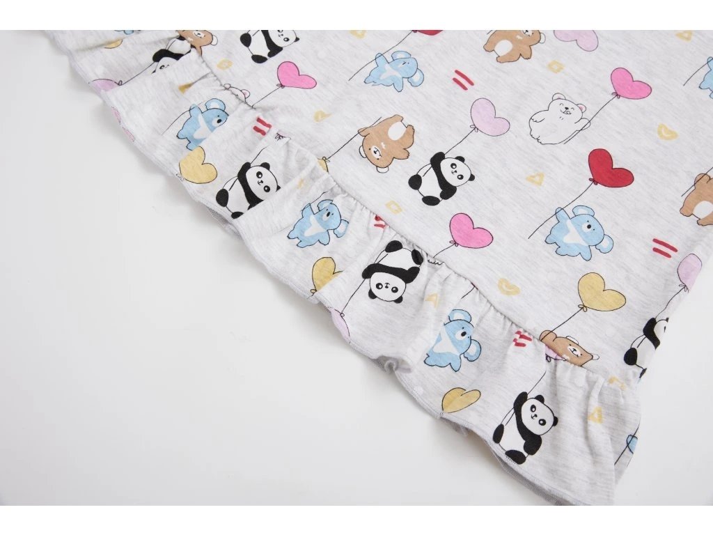 Roztomilá noční košilka pro mladé slečny s celoplošným potiskem malých medvídků (koala, panda, lední medvěd, medvěd hnědý) vznášejících se ve vzduchu na balóncích ve tvaru srdíček. Noční košile má dlouhý rukáv - hřeje ruce, ze kterých většinou peřina v noci sklouzne. Spodní část košilky je zdobená volánkem ze stejné látky. Spaní jak pro princezničky.