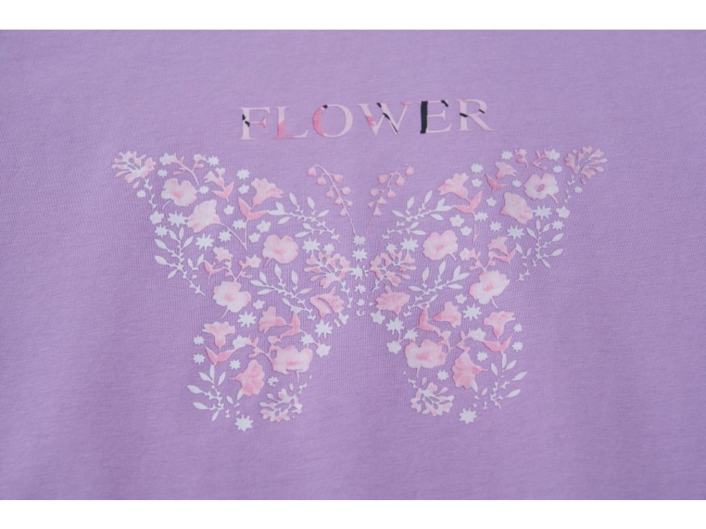 Stylové tričko pro dívky ve věku cca 10–14 let potěší všechny milovnice jemné elegance i přírody. Jednobarevný základ ve fialové nebo klasické černé doplňuje výrazný potisk motýla složeného z drobných květinek a decentní nápis FLOWER.