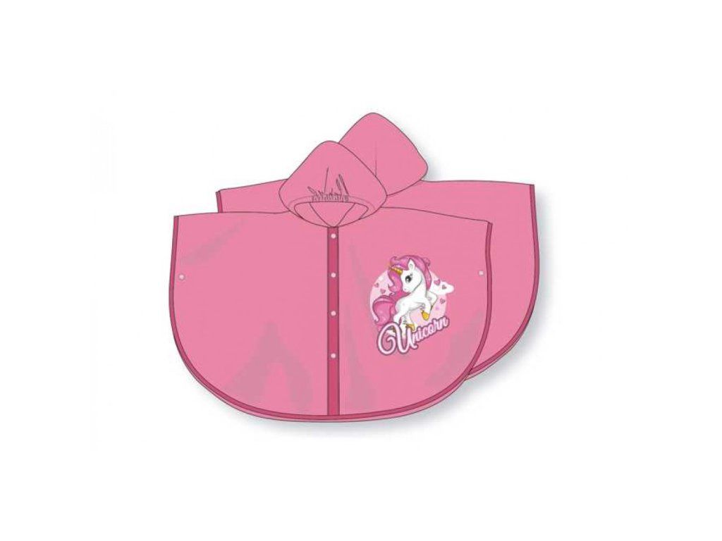 Praktická pláštěnka ve tvaru ponča, kterou užijete na pěším i cyklistickém výletě. Pohodlně ji přehodíte i přes batoh na zádech. Dítě se do ní vejde i v teplejším oblečení, nemusí se soukat do úzkých rukávů. Pokud na pláštěnce rukáv přece jen chcete, můžete si ho udělat díky patentu na každé straně u lemu pláštěnky. V kapuci je v oblasti čela pružná gumička, aby seděla dobře na hlavě i ve větru. Pončo nemá kapsy, na předním díle je potisk - růžový jednorožec. Zadní strana je jednobarevná - růžová.
