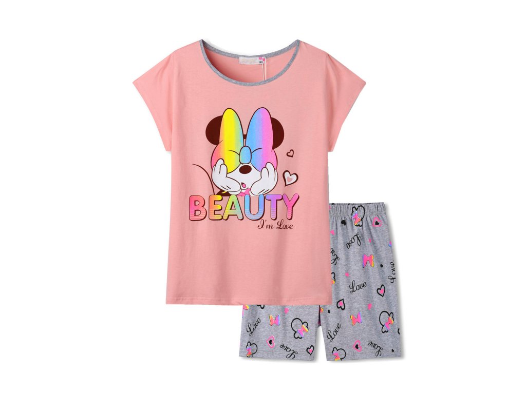 Pyžámko z příjemné bavlny pro teplé noci. Hezky saje pot a pokožku nijak nedráždí. Duhový potisk myšky na triku a mašliček na kraťasech do gumy, naladí na veselé sny.